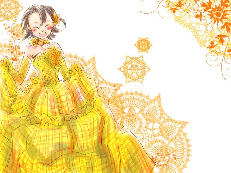 黄色いほうは、切り替えが多くフリル、バルーン状のスカート部分、共布の髪飾りと手袋。